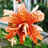 Красивая и мощная тигровая красотка, если ваш выбор остановится на азиатском гибриде Флоре Плено! На метровом стебле с наступлением лета появится около десяти бутонов, которые постепенно, один за одним начнут раскрываться и превращаться в огромные (по 16-18 см) огненно-оранжевые краповые соцветия с выгнутыми к стеблю лепестками. И чем больше закрутятся лепестки, тем пышнее и объемнее будет выглядеть эта поистине королевская лилия.