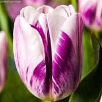 Шикарный и яркий пестро окрашенный тюльпан Фламинг Флаг, вырастающий до полуметра в высоту, станет лучшим украшением весенней клумбы. На его упругом прочном стебле в конце апреля начинает раскрываться огромный белый бутон, украшенный насыщенными сиреневыми штрихами.